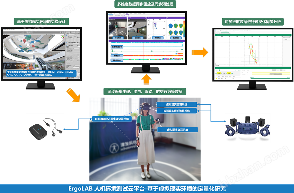 通过基于自主技术研发的ErgoVR人因分析引擎,直接对接VR原型。在人员与虚拟样机交互过程中,同步采集个体主观评价、眼动、人机交互、生理、脑电、脑成像、行为、动作姿态以及VR原型、物理环境等多维度数据,并通过专业的数据分析模块进行处理与统计,形成针对不同维度的定量化人因测评报告。